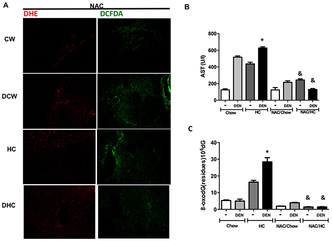 Figure 6: N-acetylcysteine prevents oxidative stress and DNA oxidative damage. A cohort of animals treated for 7 days received 80 mmol/L N–acetyl–L-cysteine (NAC) in drinking water ad libitum. (A) Reactive oxygen species content in liver tissue were determined by dihydroethidium (DHE, 5 μM, in red) and 2’,7’ –dichlorofluorescin diacetate (DCFDA, 5 μM, in green). Representative images obtained by confocal microscopy. Original magnification X100. (B) Serum aspartate aminotransferase (AST) activity, (C) 8-oxodeoxiGuanine (8-oxodG) content determined by HPLC. Each column represents the mean ± SEM in at least four different mice. *, p ≤ 0.05 vs Chow control animals; &, p ≤ 0.05 vs DEN treated Chow.
