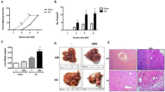 Figure 7: Mice subjected to HC diet are more susceptible than Chow mice to DEN-induced hepatocarcinogenesis. (A) Incidence and time course of hepatic lesions from 1 to 8 months after DEN treatment, (B) multiplicity of foci per square centimeter. (C) Liver to body weight ratio at month 8. Each column or point represent the mean ± SEM in at least four different mice. *, p ≤ 0.05 vs Chow control animals; &, p ≤ 0.05 vs DEN treated Chow, (D) Macroscopic inspection of the livers at month 8, (E) Histology appearance by H&E staining, perilobular, periportal inflammation (black arrow), cholestasis (yellow arrow), inflammation (·), tumor (T), surrounding tissue (ST). Images are representative of at least 4 different mice, original magnification X200.