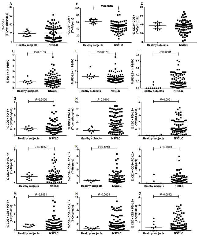 Anti-PD-1 ICIs have achieved higher therapeutic responses than standard-of-care chemotherapy in patients with advanced NSCLC, both in the second-line [17-19] and first-line [20] setting. In these studies, tumor PD-L1 expression was generally associated with higher responses to anti-PD-1 therapy [17, 18, 21-23]. However, a significant number of patients with PD-1/PD-L1 positive tumors fail to respond to treatment with anti-PD-1 ICIs and a significant number of patients (15-40%) with PD-L1 negative tumors benefit from anti-PD-1 ICIs. Consequently, there is still considerable debate with regards to the prognostic and predictive value of tumor PD-L1 expression in stratifying patients eligible for such interventions. Several reports have shown that the expression of PD-1/PD-L1/PD-L2 on the surface of infiltrating T-cells and circulating tumor cells (CTCs) is associated with poor prognosis [24, 25]. However, the prognostic value of PD-1/PD-L1/PD-L2 expression on peripheral T-cells from NSCLC patients has not been sufficiently evaluated. The aim of this study was to determine whether the expression of PD-1/PD-L1/PD-L2 on PBMCs, particularly on T-cell subsets, was associated with different survival outcomes in NSCLC patients.