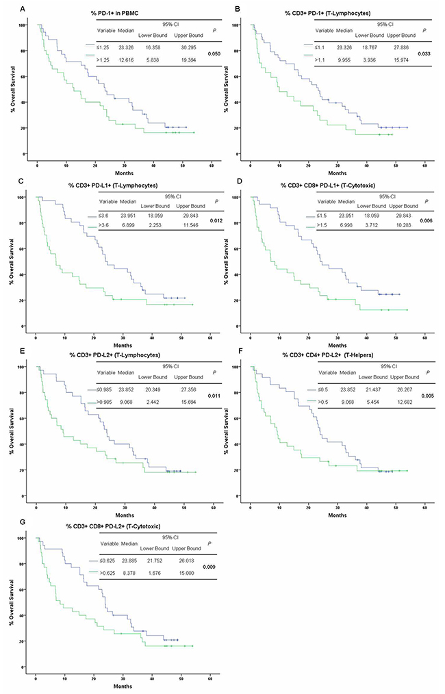 Continuous data were summarized as arithmetic means with standard deviations (SDs) or medians with ranges according to data distribution. Two group comparisons were tested using Student’s t test or Mann-Whitney U (according to data distribution determined by the Kolmogorov Smirnov test). Nominal data was analyzed using the chi square (X2) test. Immune parameters associated with clinical variables were determined by bivariate analysis. Correlations were computed by linear regression and analyzed using the Spearman rank correlation test. The Receiver Operating Characteristic (ROC) method was performed to find the best cut-off point value for PD-1, PD-L1 and PD-L2 to be used for the survival analysis. OS curves were estimated by the Kaplan–Meier method while comparisons among groups were analyzed with log-rank or Breslow tests. Statistically significant and borderline variables (P values ≤0.1) were included in the multivariate analyses. Statistical significance was determined as P ≤0.05 with a two-sided test. All data were analyzed using the SPSS software package version 20 (SPSS, Inc., Chicago, IL, US).