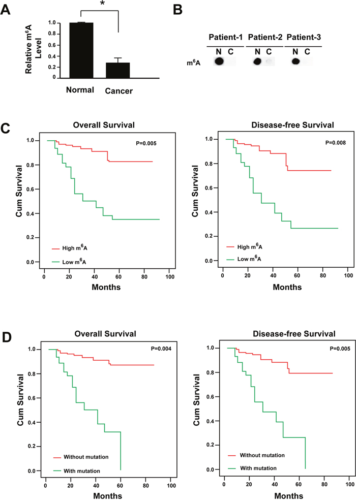 Figure 1: Reduced m6A is correlated with the poor prognosis of cervical cancer. (A) m6A levels in cancer tissues and adjacent normal tissues were determined by dot blot (n=286). The relative dot density was measured by Image J. * P<0.05. (B) Representative figure for m6A levels in cancer tissues and adjacent normal tissues. N: adjacent normal tissues; C: cancer tissues. (C) Kaplan-Meier survival curve of patients with high or low level of m6A. (D) Kaplan-Meier survival curve of patients with or without mutation of m6A regulators.