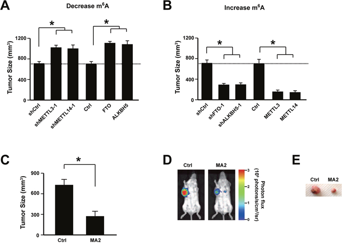 Figure 4: Increasing m6A level suppressed cervical cancer development in vivo. (A) Knocking down METTL3 and METTL14 or overexpressing FTO and ALKBH5 promoted cervical cancer development in vivo. n = 12. * P<0.05. (B) Knocking down FTO and ALKBH5 or overexpressing METTL3 and METTL14 suppressed cervical cancer development in vivo. n = 12. * P<0.05. (C) FTO inhibitor MA2 treatment suppressed cervical cancer development in vivo. n = 12. * P<0.05. (D) Representative luciferase signal density measured via IVIS 50 imaging system. (E) Representative tumors isolated from the mice treated with MA2 or control.