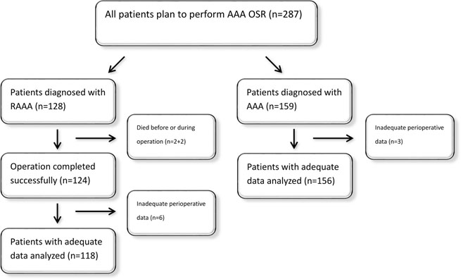 The patients in this study were recruited from the Vascular Department of West China Hospital, Sichuan University, between November 2003 and January 2017. As shown in Figure 3, in total, 287 patients were planned to perform AAA OSR. 274 patients who underwent OSR for AAA were included in this study finally. They were divided on the basis of ruptured (118) and unruptured (156) AAA. Cases of AAA were diagnosed and were measured via ultrasound, computed tomography, or magnetic resonance angiography and were proven after OSR. Patients with renal impairment (preoperative serum creatinine (SCr) >150 μmol/L) were not excluded because such condition could be considered an independent risk factor for postoperative renal dysfunction. Patients who died preoperatively or intraoperatively or who did not undergo OSR were all excluded.