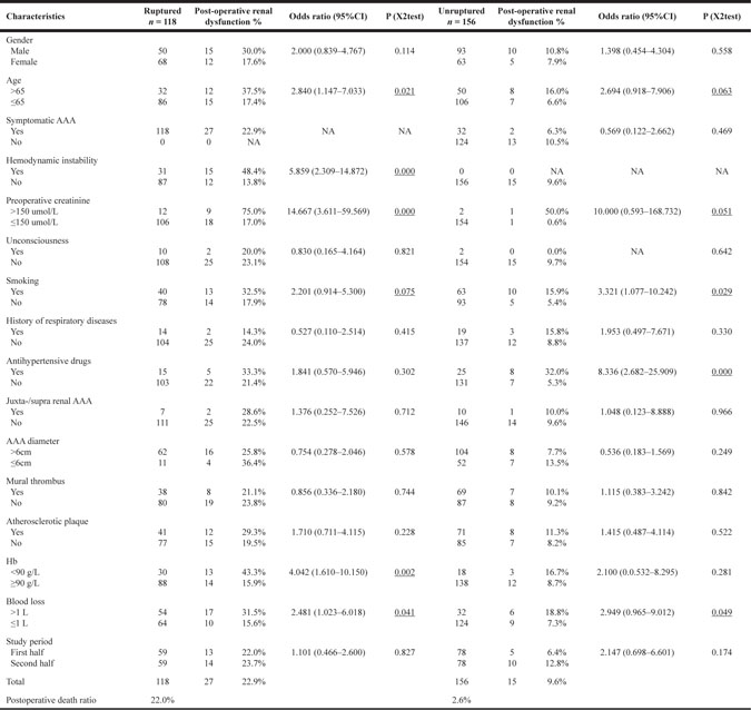Patient characteristics and postoperative renal outcomes are shown in Table 1. During the study, 274 patients successfully underwent OSR. A total of 118 were proven to have rAAAs, whereas 156 did not. The median age of the ruptured group was 58.2 ± 12.1 years, with the majority being female (n = 68; 57.6%), whereas that of the unruptured group was 57.8 ± 13.7 years, with the majority being male (n = 93; 59.6%). Among patients with juxta-/supra renal AAA, 4 in ruptured group and 6 in unruputured group were found to have had supra renal clamping. In the ruptured group, candidate univariate (P < 0.100) analysis of risk factors included age >65 (P = 0.021), preoperative creatinine >150 μmol/L (P < 0.000), hemodynamic instability (P < 0.001), smoking (P = 0.075), Hb <90 g/L (P = 0.002), and blood loss >1 L (P = 0.041). However, for the unruptured group, it included age >65 (P = 0.063), preoperative creatinine >150 μmol/L (P = 0.051), smoking (P = 0.029), antihypertensive drugs (P < 0.001), and blood loss >1 L (P = 0.049).