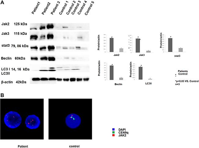Figure 1: T-ALL patients showed JAK-STAT pathway activity and up-regulated autophagy. (A) The peripheral blood mononuclear cells were collected from 3 T-ALL patients and 5 healthy controls. The cells were lysed and analysed by western blotting. An increase in the JAK-stat pathway-related proteins was observed in all 3 of the patients compared to the healthy controls as shown in the 3 upper lanes. The expression of the autophagy-related proteins was also increased in all 3 of the patients compared to the healthy control as shown in the 2 middle lanes. All of the samples were normalized to β-actin (bottom lane) Bands of western blotting were quantified by densitometry with Scion Image software (Image J 1.48u). We used the LC3B-II/loading control ratio rather than the LC3B II/LC3B-I ratio for qualifcation of LC3-II expression levels according to a newly published guideline. All the results were analysed using SPSS11.0. The graphs were listed respectively. (B) Representative picture of the FISH analysis. The patient samples that possessed a JAK2 copy gain (red dots) are shown on the left, and the control sample that possessed a normal JAK2 copy number (red dots) is shown on the right. All of the samples were also analysed with the CEN9q probe as an internal reference (green dots). The nuclei were all counter-stained with DAPI (blue).