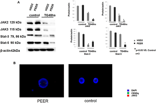 Figure 2: TG101209 down-regulated the JAK-STAT pathway in the T-ALL cell lines. (A) The T-All cell lines HSD2 and PEER were treated with TG101209 for 48 hours and lysed for western blotting. Untreated cells were used as the control group. The expression levels of the JAK-stat pathway related proteins JAK2 (1st lane), JAK3 (2nd lane), Stat3 (3rd lane) and Stat5 (4th lane) were all decreased after TG101209 treatment. All of the samples were normalized with β-actin (bottom lane). Bands of western blotting were quantified by densitometry with Scion Image software (Image J 1.48u). All the results were analysed using SPSS11.0. The graphs were listed respectively. (B) Representative image of the FISH analysis. The PEER, which possess a JAK2 copy gain (red dots), are shown in the left. The control samples, which possesses a normal JAK2 copy number (red dots), is shown on the right. All of the samples were also analysed with the CEN9q probe as an internal reference (green dots). The nuclei were all counter-stained with DAPI (blue).