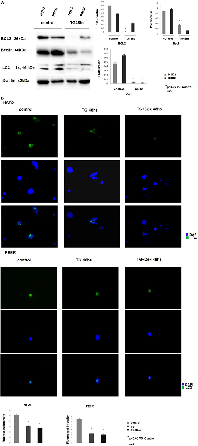 The Peer and HSD-2 cell lines were treated with TG101209 (2 μM), HCQ (50 μM, 100 μM) or TG101209 (1 μM) + Dex (100 μM) for 48 h and then collected and fixed in ice-cold 100% methanol for 15 min at -20°C. Then, the cells were smeared onto an amino silane (APS)-coated slide. After air dying, the samples were blocked in blocking buffer (1X PBS, 5% normal serum, and 0.3% Triton™ X-100) for 60 min at room temperature. LC3 was diluted in antibody dilution buffer (1X PBS, 1% bovine serum albumin (BSA), and 0.3% Triton X-100) at a 1:100 ratio and incubated at 4°C overnight, followed by incubation with a fluorochrome-conjugated secondary antibody diluted in antibody dilution buffer for 1 h at room temperature in the dark. The slides were also incubated with the ProLong Gold Antifade reagent with DAPI (Cell Signaling Technology, #8961). The samples were observed and imaged using a Zeiss AX10 Scope A1. All experiments were repeated 3 times. The fluorescence intensity of single cell was quantified by densitometry with Scion Image software (ImageJ 1.48u).