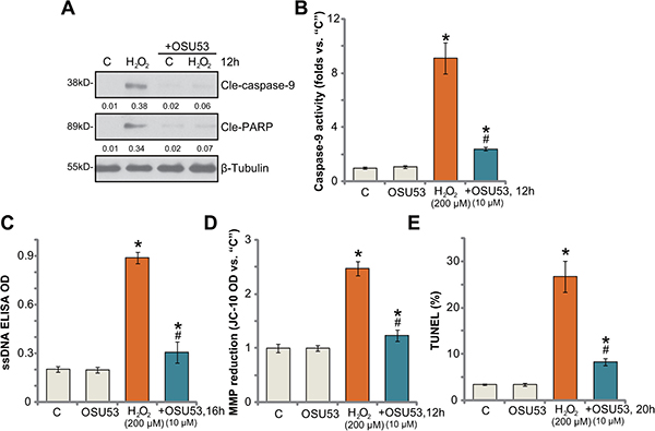 Next, the potential effect of OSU53 on H2O2-induced neuronal apoptosis was analyzed. As shown in Figure 2A, treatment with H2O2 (200 μM) in cultured murine spinal cord neurons induced cleavage of both caspase-9 and PARP [poly (ADP-ribose) polymerase]. Meanwhile, the caspase-9 activity was also increased in H2O2-treated neurons (Figure 2B). Such actions by H2O2 were largely attenuated with co-treatment of OSU53 (Figure 2A–2B). Additionally, H2O2 stimulation in the neurons also induced production of single strand DNA (“ssDNA”) (Figure 2C), mitochondrial depolarization (Figure 2D, JC-1 OD increase [20]) and TUNEL (terminal transferase uridyl nick end labeling) nuclei increase (Figure 2E), which all largely attenuated by OSU53. Therefore, these results suggest that OSU53 inhibits H2O2-induced spinal cord neuronal apoptosis.