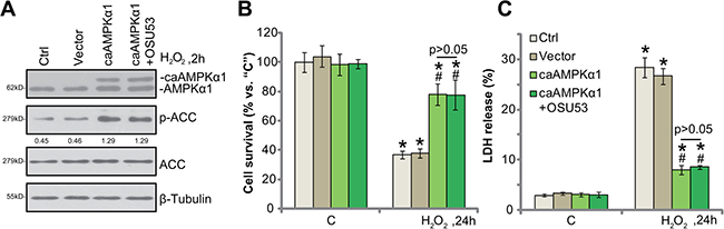 Figure 4: Constitutive activation of AMPK protects spinal cord neurons from H2O2. The primary cultured murine spinal cord neurons, expressing the constitutive-active AMPKα1 (T172D, “caAMPKα1”, Flag-tagged) or empty vector (pSuper-puro-Flag, “Vector”), as well as the control neurons (“Ctrl”) were treated with hydrogen peroxide (H2O2, 200 μM), or plus OSU53 (10 μM) for employed time, total and phosphorylated (“p”) AMPKα1 and ACC were shown (A), p-ACC (vs. total ACC) were quantified (A); Neuronal survival (CCK-8 assay, (B) and death (LDH release assay, (C) were also tested. For each assay, n = 5. *p < 0.05 vs. “C”. #p < 0.05 vs. “Ctrl” cells. Experiments in this figure were repeated three times, and similar results were obtained.