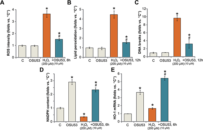 Figure 5: OSU53 inhibits H2O2-induced oxidative stress in spinal cord neurons. Primary cultured murine spinal cord neurons were treated with hydrogen peroxide (H2O2, 200 μM), or plus OSU53 (10 μM) for indicated time; Relative ROS production (A), lipid peroxidation content (B) and DNA damages (C) were tested by the described methods; Relative NADPH content (D) and HO-1 mRNA expression (E) were also tested. For each assay, n = 5. *p < 0.05 vs. “C”. #p < 0.05 vs. H2O2 only group. Experiments in this figure were repeated three times, and similar results were obtained.