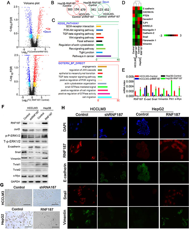 Total RNA was isolated from HCC cells and tissues using TRI Reagent (Invitrogen, USA) according to the supplier’s protocol. The quality of RNA was evaluated using an Agilent 2100 Bioanalyzer (Agilent , Germany). cDNA synthesis was carried out according to the manufacturer’s instructions, with the analysis performed by Majorbio (Shanghai, China). RNA-Seq reads were aligned to the human reference sequence National Center for Biotechnology Information (NCBI) hg19 with TopHat2 to calculate the values of fragments per kilobase of transcript per million mapped reads for known transcripts (FPKM). A two-class comparison of the pool of RNF187 high and the corresponding RNF187 low cell was performed to determine differentially expressed genes. We selected a fold change of 2 as the threshold for upregulation or downregulation, with a P-value < 0.05 of the fold-change being considered to be statistically significant.