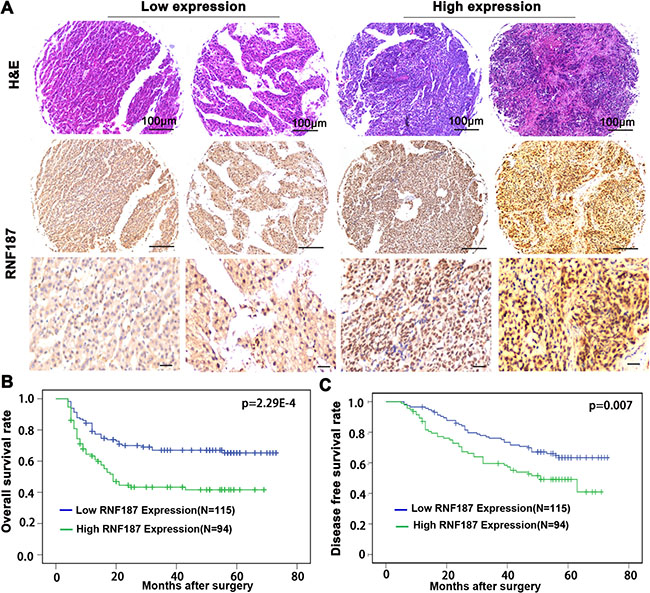 Tissue microarrays were constructed as described in an earlier study [3]. Immunohistochemistry (IHC) was performed using a two-step detection system (Dako, Carpinteria, CA) as previously described. Briefly, formalin-fixed and paraffin-embedded sections with a thickness of 4 μm were dewaxed in xylene and graded alcohols, hydrated, and washed in PBS. after microwave antigen retrieval (12 min in sodium citrate buffer, pH 6), the endogenous peroxidase was inhibited by 0.3% H2O2 for 30 min and the sections were incubated with 10% normal goat serum for 30 min. Primary antibodies (RNF187, 1:100) were applied overnight in a moist chamber at 4°C, followed by incubation for 30 min with the secondary antibody (RE7112, Novolink Polymer). The sections were developed in 3,3′-diaminobenzidine solution under microscopic observation and counterstained with hematoxylin. Negative control slides in which the primary antibodies omitted, were included in all IHC assays. The intensity of RNF187 was classified as high and low expressions (RNF187high > 50% of tumor section, and RNF187low ≤ 50%, respectively).