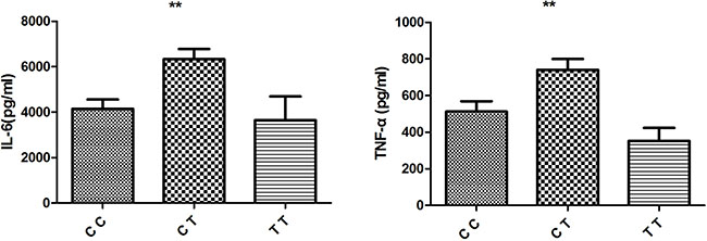 According to these results, different genotypes of rs4246905 could affect TNFSF15 expression following LPS stimulation, and further functional studies were performed to investigate whether the different genotypes of rs4246905 could also affect cytokine production. ELISAs were used to examine the IL-6 and TNF-α levels in cell culture supernatants following LPS stimulation of PBMCs from 48 healthy, genotyped individuals. The results indicated that IL-6 and TNF-α production by the stimulated PBMCs from the CT carriers of TNFSF15 was greater than that of the CC/TT carriers (Figure 4).
