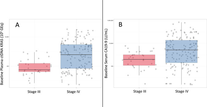Figure 2: Boxplots of ctDNA KRAS (A) and CA19-9 (B) for baseline detected samples.