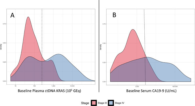Figure 3: (A) Density plot of ctDNA KRAS copies per 105 GEq in 177 patients with detectable baseline results stratified by stage. Dotted vertical line denotes the bimodal cutpoint of approximately 250 copies per 105 GEq. (B) Density plot of CA19-9 U/mL for 167 patients with detected baseline samples stratified by stage. Dotted vertical line denotes the median cutpoint of approximately 1,890 units per milliliter.