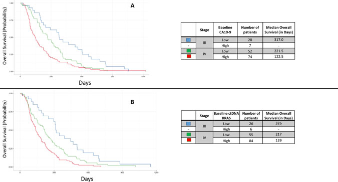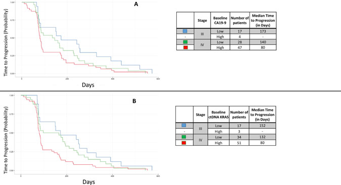 Baseline ctDNA KRAS was associated with time to progression (TTP). In a multivariate analysis with CA19-9 and the additional co-variates (stage, gender, baseline ECOG performance status), ctDNA KRAS remains highly significant while CA19-9 was less significant.