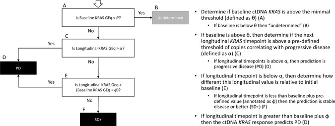First, we assessed the longitudinal trends in quantitative ctDNA KRAS mutation load and correlated with RECIST 1.1 data and investigator assessed response. The trends observed between longitudinal measurements of ctDNA KRAS and RECIST 1.1 status were strong enough to be explicitly quantified and demonstrated the ability to identify RECIST 1.1 response by measuring quantitative changes in ctDNA KRAS mutation load as compared to baseline. Given a minimal threshold of ctDNA KRAS copies at baseline (annotated as θ), trends were analyzed over large search grids to determine the minimum ctDNA KRAS copies correlating with ctDNA KRAS response of PD (annotated as α). If a longitudinal measurement was less than the α minimum PD threshold and less than the baseline measurement plus a corresponding shift threshold (annotated as ϕ), the ctDNA KRAS response was assessed as SD+. Otherwise, the ctDNA KRAS response was called to be PD (Figure 5).