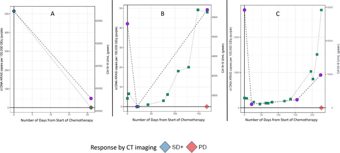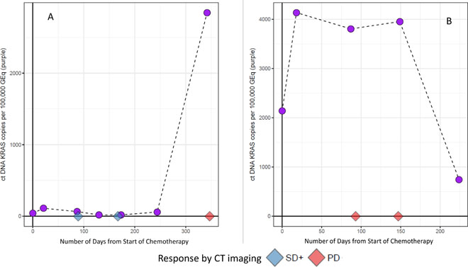 Additional analyses were performed for those samples with two or more plasma collection timepoints and RECIST 1.1 CT scan data available. Analysis was restricted to patients with a detectable baseline ctDNA KRAS result and at least one subsequent longitudinal ctDNA timepoint within 7 days of a CT scan with RECIST 1.1 assessment. RECIST 1.1 response was simplified and reported as PD or SD+. SD+ includes a RECIST 1.1 assessment of stable disease, partial response, or complete response [56].
