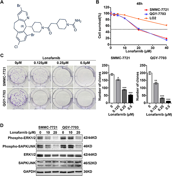 Figure 1: Lonafarnib inhibits growth of human HCC cells. (A) Chemical structure of lonafarnib. (B) Dose escalation effect of lonafarnib on cell viability. HCC cell lines (SMMC-7721 and QGY-7703) and the immortalized hepatic cell line LO2 were incubated with different concentrations of lonafarnib as indicated; the IC50 value at 48 h was determined in these cell lines: SMMC-7721 (20.29 μM), QGY-7703 (20.35 μM) and LO2 (undetectable). CCK-8 assay was used to detect the cell viability and the dashed line indicated the IC50 line. The data are presented as the means ± SD. (C) Colony formation assay in SMMC-7721 and QGY-7703 cells. After lonafarnib treatment, cells were fixed and stained with crystal violet. Left panel: representative image of colonies; right panel: the number of colonies is summarized and presented as the mean ± SD. *P < 0.05; **P < 0.01; ***P < 0.001. (D) Western blot analysis of protein levels of phospho-ERK1/2, phospho-SAPK/JNK, total ERK1/2 and total SAPK/JNK in HCC cells treated with lonafarnib as indicated.