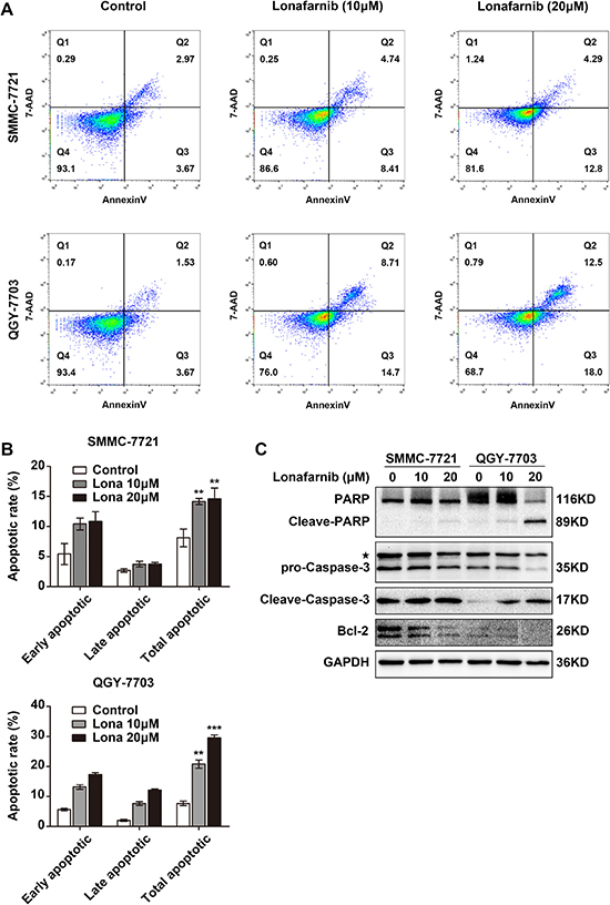Figure 2: Lonafarnib induces apoptosis in HCC cells. (A) Representative image of flow cytometric analysis of apoptotic SMMC-7721 and QGY-7703 cells stained with Annexin V-FITC/7-AAD after lonafarnib treatment. (B) The flow cytometry results are summarized in the panel. The data are presented as the means ± SD. **P < 0.01; ***P < 0.001. (C) Western blot analysis of levels of apoptosis-related protein including PARP, cleaved PARP, pro-Caspase-3, cleaved Caspase-3 and Bcl-2 in HCC cells treated with lonafarnib as indicated. The asterisk indicates a non-specific band.