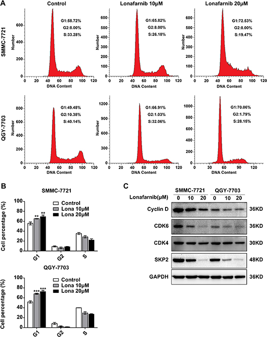 Figure 3: Lonafarnib causes G1 to S phase arrest in HCC cells. (A) Representative image of flow cytometric analysis of cell cycle distribution of SMMC-7721 and QGY-7703 cells after lonafarnib treatment as indicated. (B) The flow cytometry results are summarized in the panel. The data are presented as the means ± SD. **P < 0.01; ***P < 0.001. (C) Western blot analysis of levels of cell cycle-related proteins including Cyclin D, CDK4, CDK6 and SKP2 in HCC cells treated with lonafarnib as indicated.