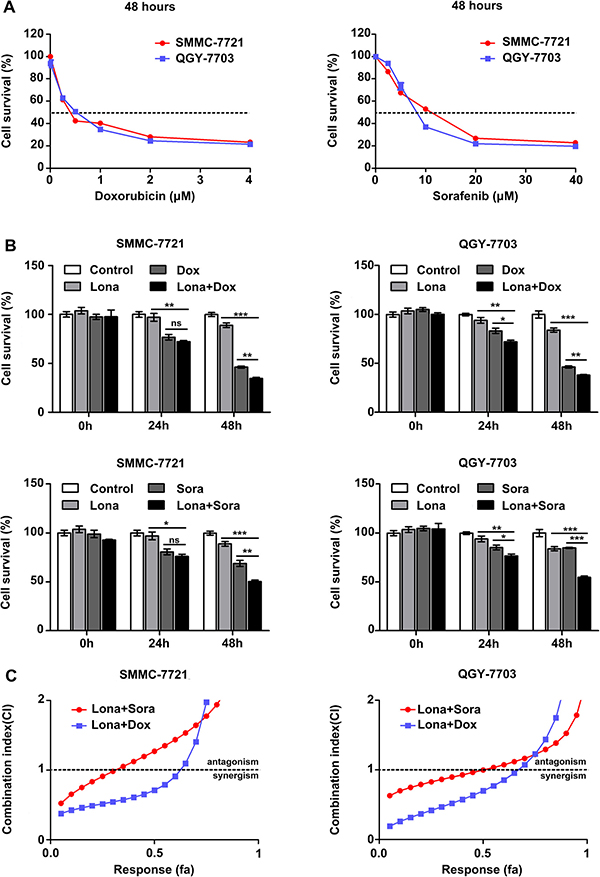Figure 4: Lonafarnib displays a synergistic effect with doxorubicin and sorafenib. (A) Dose escalation effect of doxorubicin and sorafenib on the viability of HCC cells measured by CCK-8 assay. The dashed line indicated the IC50 line and the IC50 value for both drugs at 48 h was determined in these cell lines. SMMC-7721: doxorubicin (0.25 μM) and sorafenib (10.37 μM); QGY-7703: doxorubicin (0.38 μM) and sorafenib (8.86 μM). The data are presented as the means ± SD. (B) CCK-8 assay in HCC cells treated with low and appropriate doses of doxorubicin and sorafenib in combination with 2.5 μM lonafarnib as indicated. Cell viability was examined 48 hours after treatment using the CCK-8 assay. The data are presented as the means ± SD. NS, not significant; *P < 0.05; **P < 0.01; ***P < 0.001. (C) HCC cells were treated using increasing concentrations of lonafarnib and doxorubicin or sorafenib, either alone or at a fixed ratio (1:10 for doxorubicin and 1:1 for sorafenib). The combination index was calculated as described in Materials and Methods and is plotted vs. affected fraction.