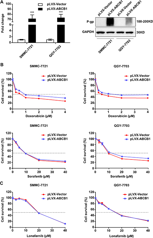 Figure 5: ABCB1 overexpression promotes the chemoresistance phenotype in HCC cells. (A) The mRNA (left panel) and protein (right panel) expression levels of ABCB1 in lentivirus infected SMMC-7721 and QGY-7703 cells. The data are presented as the means ± SD. ***P < 0.001. (B and C) Cytotoxic effect of doxorubicin, sorafenib (B) and lonafarnib (C) on the viability of control and ABCB1-overexpressed HCC cells. Cells were cultured in the presence of different concentrations of doxorubicin (0, 0.25, 0.5, 1, 2 and 4 μM), sorafenib (0, 2.5, 5, 10, 20 and 40 μM) and lonafarnib (0, 2.5, 5, 10, 20 and 40 μM) for 48 h, and cell viability was determined using the CCK-8 assay. The data are presented as the means ± SD.