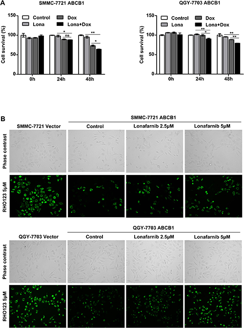 Figure 6: Lonafarnib reduces ABCB1-mediated chemoresistance in HCC cells. (A) ABCB1-overexpressing HCC cells were treated with 0.25 μM doxorubicin in combination with 2.5 μM lonafarnib, and cell viability was determined 48 h after treatment using the CCK-8 assay. The data are presented as the means ± SD. NS, not significant; *P < 0.05; **P < 0.01. (B) RHO123 staining assay of ABCB1-overexpressing HCC cells. Cells were stained with 5 μM RHO123 after lonafarnib treatment as indicated. Intracellular fluorescence was observed and photographed under a microscope to measure cellular efflux pump activity.