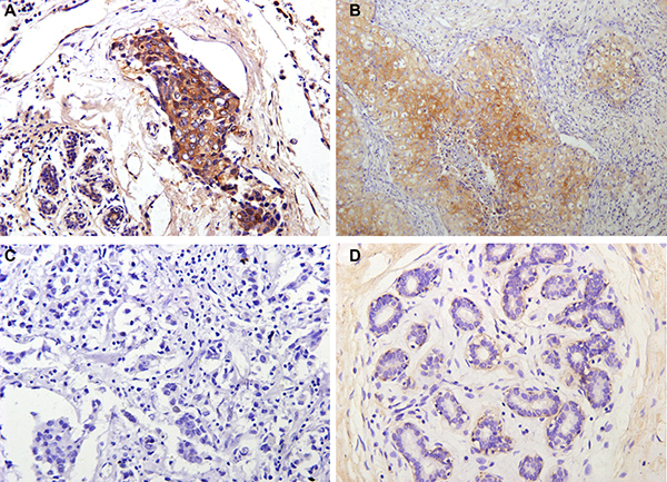 Figure 1: Representative immunohistochemical staining for DDEFL1 in breast cancer and paired normal breast tissue. Positive DDEFL1 immunostaining was seen in invasive breast cancer (A and B), the patterns of DDEFL1 expression were cytoplasmic staining, whereas the paired normal breast tissues showed no staining of mammary epithelium (D). Negative DDEFL1 immunostaining was shown in cancer cells (C). Original magnification, all ×200.