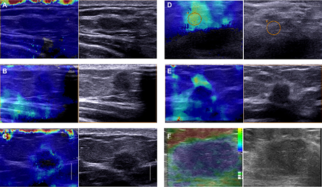 Figure 2: Representative pictures for the shear wave elastography score of breast cancer. (A) The SWE image showed a case of breast cancer with SWE stiffness values of 1. On conventional B-mode US the lesion was classified BI-RADS 4B. Pathologic result: breast invasive ductal cancer. (B) The SWE image showed a case of breast cancer with SWE stiffness values of 2. On conventional B-mode US the lesion was classified BI-RADS 4B. Pathologic result: breast invasive ductal cancer. (C) The SWE image showed a case of breast cancer with SWE stiffness values of 3. On conventional B-mode US the lesion was classified BI-RADS 4B. Pathologic result: breast invasive ductal cancer. (D) The SWE image showed a case of breast cancer with SWE stiffness values of 4. On conventional B-mode US the lesion was classified BI-RADS 4C. Pathologic result: breast invasive ductal cancer. (E) The SWE image showed a case of breast cancer with SWE stiffness values of 5. On conventional B-mode US the lesion was classified BI-RADS 4C. Pathologic result: breast invasive ductal cancer. (F) The SWE image showed a case of breast cancer with SWE stiffness values of 5. On conventional B-mode US the lesion was classified BI-RADS 5. Pathologic result: breast invasive ductal cancer.