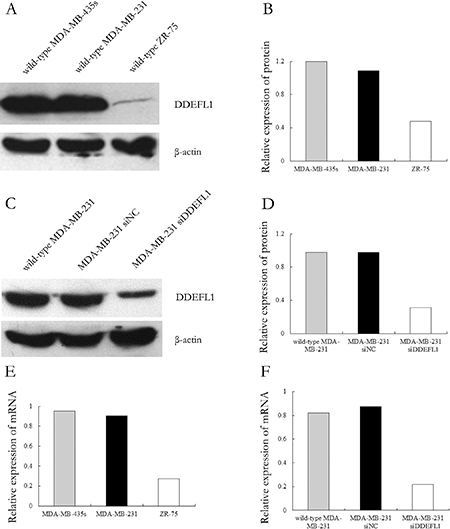 Figure 3: Expression patterns of DDEFL1 in breast cancer cell lines. Total RNA and proteins were extracted from wild-type MDA-MB-435s, MDA-MB-231, and ZR-75 and then subjected to qRT-PCR and Western blotting for DDEFL1. Both protein (A and B) and mRNA (E) expression of DDEFL1 were observed consistently in MDA-MB-231 and MDA-MB-435s, but ZR-75 had very weak DDEFL1 mRNA and protein expression (A, B, and E). Therefore, we picked MDA-MB-231 for transfection with DDEFL1 siRNA. DDEFL1 protein (C and D) and mRNA (F) expression were obvious in the DDEFL1 siRNA-NC transfection group or wild-type MDA-MB-231 but very weak in the DDEFL1 siRNA transfection group, indicating an effective down-regulation of DDEFL1 in MDA-MB-231 by DDEFL1 siRNA.