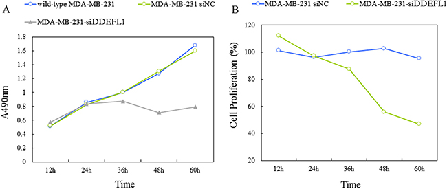 MTT results and the proliferation curve was shown in Figure 4, the cell proliferation rate of the DDEFL1 siRNA transfection group was markedly lower than that of the siRNA-NC transfection group or control group at 48, 60, and 72 h (p < 0.05), indicating that DDEFL1 siRNA induced the decreased cellular proliferation of MDA-MB-231.