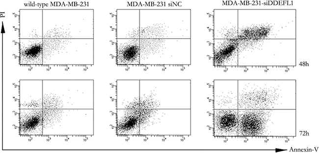 As shown in Figure 5, MDA-MB-231 transfected with DDEFL1 siRNA showed different percentages of apoptosis with the siRNA-NC transfection group or the group of MDA-MB-231 without treatment at 48 h and 72h after transfection. The apoptotic ratio of the DDEFL1 siRNA transfection group was present at 46.8% at 48 h and 52.7% at 72 h after transfection, which was higher than the siRNA-NC transfection group (13.1% at 48 h and 10.7% at 72 h after transfection, respectively) or the group of MDA-MB-231 without treatment (15.1% at 48 h and 12.9% at 72h after transfection, respectively; p < 0.05).