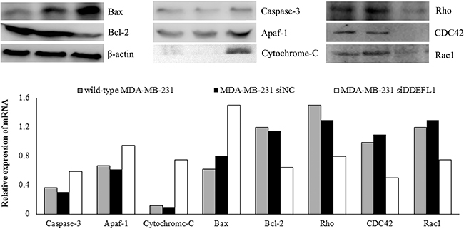 Figure 7: DDEFL1 siRNA transfection up-regulated the expression of apoptosis protein in MDA-MB-231. Western blotting and qRT-PCR results showed that siRNA transfection up-regulated the mRNA and protein expression of caspase-3, Apaf-1, cytochrome c, and Bax and down-regulated the mRNA and protein expression of Bcl-2. Western blotting and qRT-PCR results also showed that DDEFL1 siRNA transfection down-regulated the mRNA and protein expression of Rho, CDC42 and Rac1.