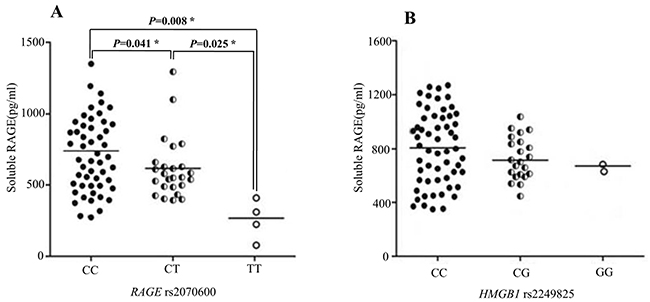 The serum levels of sRAGE based on the RAGE rs2070600 and HMGB1 rs2249825 genotypes