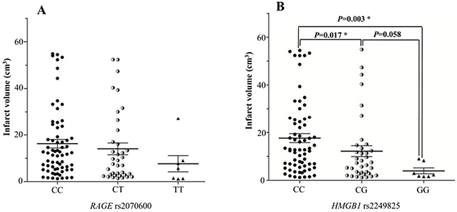 Associations of the RAGE and HMGB1 polymorphisms with the actual volumetric measurements of infarct volume by DWI in 111 IS patients were explored, and the results are shown in Figure 2. The mean infarct volumes in the IS patients with the HMGB1 variant genotypes (CG and GG) were significantly lower than those in patients with the major CC genotype (P = 0.017 and P = 0.003, respectively). However, no difference in infarct volume was observed in IS patients with the RAGE variant genotypes or major genotypes.