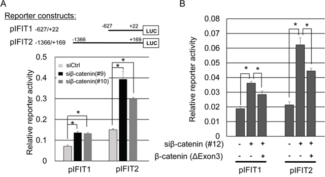 Figure 2: Association between the reporter activities of IFIT1 and IFIT2, and β-catenin expression. (A) Reporter activities of pIFIT1 and pIFIT2 in the presence or absence of β-catenin siRNA in SW480 cells. The cells were transfected with the indicated reporter plasmids in combination with different β-catenin siRNAs (#9 or #10) or control siRNA. The data represents mean ± SD from three experiments. An asterisk indicates p<0.05. (B) Suppression of the induced reporter activities of pIFIT1 and pIFIT2 by β-catenin siRNA (#12) with an activating mutant form of β-catenin in SW480 cells. The mutant form of β-catenin lacks the sequence targeted by β-catenin siRNA (#12), and thus is not suppressed by the siRNA. The luciferase activities represent mean ± SD from three-independent cultures. An asterisk indicates p<0.05.