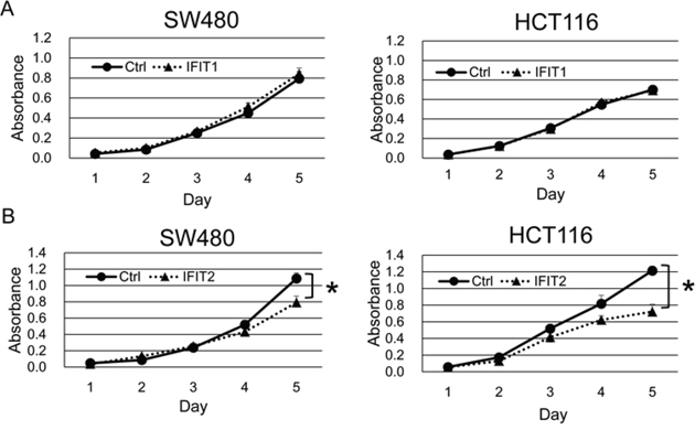 Figure 3: Effect of IFIT1 and IFIT2 on proliferation of CRC cells. The proliferation of SW480 and HCT116 cells stably expressing IFIT1 (A) or IFIT2 (B) was measured by WST-8 assay. A significant difference was determined by two-way ANOVA.