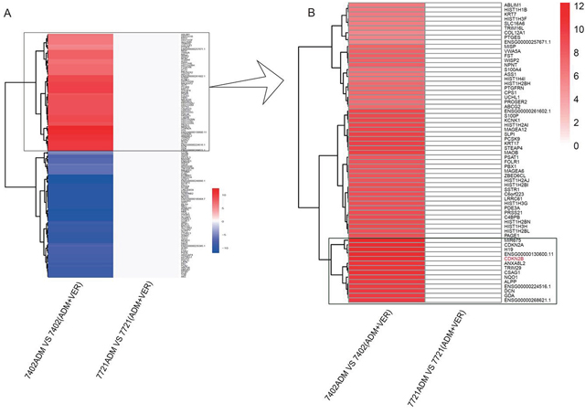 BEL-7402 has a stronger resistance to VER reversal of ADM resistance than SMMC-7721. We used SMMC-7721 and BEL-7402 to screen genes that may mediate resistance to VER reversal of ADM resistance. Using the Illumina 2000 sequencing platform, the raw data was filtered in order to convert the low quality sequence to high quality data (clean reads). We obtained samples of clean reads in line with further analysis requirements. We found a total of 135 genes in BEL-7402 with significant differences in expression (log2 (awei/a)> 1, *p <0.05) that were not altered in SMMC-7721. Of these significantly different genes (Figure 2A), 65 were significantly higher in the BEL-7402 cell line after the use of VER (Figure 2B).