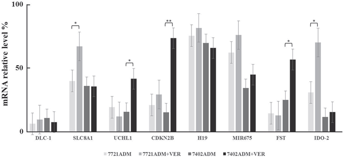 Eight upregulated or downregulated genes were selected. Genes related to drug resistance in our literature retrieval were selected as the candidate genes, namely, SLC8A1, DLC-1, FST, CDKN2B, UCHL1, IDO-2, miR-675, H19 (Figure 3). The qRT-PCR showed that the expression of CDKN2B, SLC8A1, UCHL1, FST and IDO-2 was significantly altered after VER treatment. The expression of CDKN2B, UCHL1, and FST genes between the 7721ADM group and 7721ADM + VER group had no significant difference, but were significantly increased in the 7402ADM + VER group over the 7402ADM group (* p <0.05); the CDKN2B gene was the most significantly different (** p <0.01) (Figure 3).