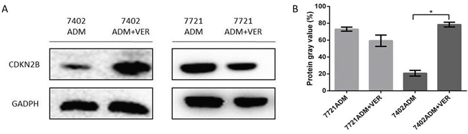 We analyzed the expression of CDKN2B/P15 protein in HCC cell lines. Figure 4 shows that the expression of CDKN2B/P15 protein was not significantly different between 7721ADM and 7721ADM+VER, but significantly increased in 7402ADM+VER over 7402ADM (*p<0.05). The expression of CDKN2B/P15 protein in SMMC-7721 cells was not significantly changed before or after VER was used, but the expression of CDKN2B/P15 protein was significantly increased in BEL-7402 cells.