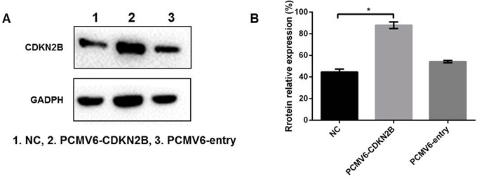 Figure 7: (A) Verification of overexpression of CDKN2B genes in 7721 genes. (B) The profiles showed the protein gray value (%). *p<0.05 compared to the NC group.