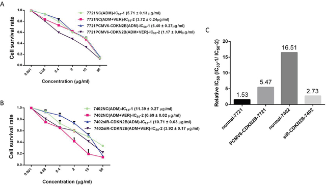 Figure 8: Changes of VER reversal of chemotherapy resistance after changing expression level of CDKN2B genes. (A) Effect of different concentrations of ADM or ADM+VER on viability of 7721NC cells or 7721PCMV6+CDKN2B cells by MTT assay; (B) effect of different concentrations of ADM or ADM+VER on viability of 7402NC cells or 7402PCMV6+CDKN2B cells by MTT assay; (C) resistance evaluation to VER reversal ADM, (Relative IC50 = IC50-1/IC50-2). The IC50 values of four types of HCC cell lines, which were treated by chemotherapeutics in the absence (IC50-1) or in the presence (IC50-2) of VER.
