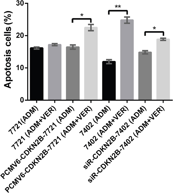 Figure 9 and Supplementary Figure 1 show that the cell apoptosis rates of SMMC- 7721 and BEL-7402 treated with ADM and ADM+VER when CDKN2B was overexpressed or silenced. The 7721 (ADM) and 7721 (ADM+VER) groups showed no significant difference in cell apoptosis at 16.4% and 17.2%, respectively. After overexpressing the CDKN2B gene (PCMV6-CDKN2B), the cell apoptosis rates of the 7721 (ADM) and 7721 (ADM+VER) groups changed to 17.1% and 22%, which represents a significant difference (*p<0.05. The results confirmed that VER obviously promotes the apoptosis of HCC cells in the presence of ADM which promotes overexpression of CDKN2B genes. The cell apoptosis rates of the 7402 (ADM) and 7402 (ADM+VER) groups were significantly different at 12.6% and 24.7%, respectively. After silencing CDKN2B gene (siR-CDKN2B) expression, the cell apoptosis rates of 7402 (ADM) and 7402 (ADM+VER) groups changed to 14.8% and 18.3%. The difference between the two groups was not significant compared with the cells before CDKN2B gene silencing.
