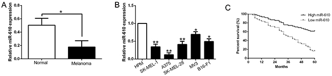 Figure 1: The decrease of miR-610 in melanoma cell lines and tissues, and the significance of decline in prognosis prediction. (A) qRT-PCR was employed for assaying related miR-610 levels in melanoma tissues and matched adjacent non-tumor tissues. (B) Comparing with the HPM cells, miR-610 expression was signally enhanced in five melanoma cell lines. The internal control was U6 snRNA. (C) Using Kaplan-Meier analyzed the prognostic value of miR-610 for melanoma patients. **P< 0.01, *P < 0.05.