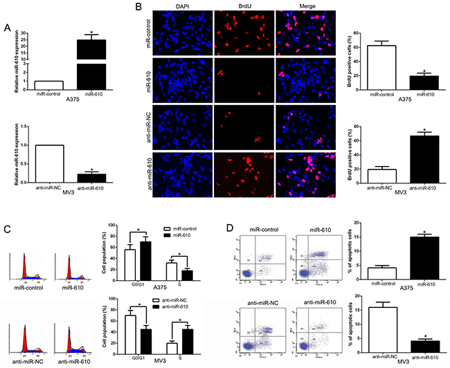 Figure 2: The biological effects of miR-610 expression. (A) The expressions of miR-610 transduced with corresponding miRNA vectors in A375 cells and MV3 cells were measured by qRT-PCR. The effects of miR-610 overexpression in A375 cells: (B) proliferation inhibition, (C) cycle progression inhibition and (D) apoptosis promotion. The inverse effects of miR-610 down-regulation in MV3 cells: (B) proliferation promotion, (C) cycle progression promotion and (D) apoptosis inhibition. n = six independent experiments. *P<0.05.