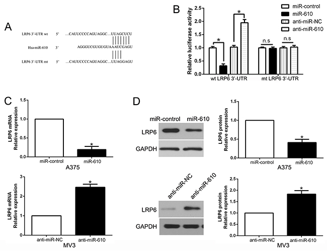 Figure 5: The role of LRP6 as a forthright target of miR-610 in melanoma. (A) miR-610 and its putative binding sequence in the 3’-UTR of LRP6. (B) The luciferase activity of LRP6 was evidently inhibited by miR-610. (C) qRT-PCR analysis of LRP6 mRNA expression in A375 and MV3 cells. (D) The effect of miR-610 overexpression and knockdown on the level of LRP6 protein in A375 cells and MV3 cells, respectively. *P<0.05.