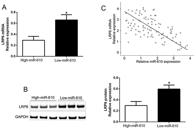 Figure 6: Inverse relevance between miR-610 and LRP6 expression in melanoma. In miR-610 high-expressed tumors (n=52), LRP6 mRNA expression (A) and LRP6 protein (B) was expressively lower than corresponding expression in miR-610 low-expressed tumors (n=53). (C) Inverse relevance between mRNA levels of LRP6 and miR-610 was evidently surveyed in melanoma tissues. *P<0.05.