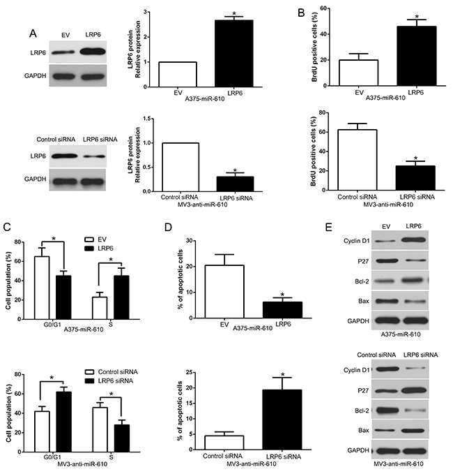 Figure 7: Alterations of LRP6 partially abrogate miR-610-mediated proliferation, cycle progression and apoptosis of melanoma cells. (A) Western blot was carried out for analyzing the levels of LRP6 in miR-610-overexpressing A375 cells and miR-610-suppressive MV3 cells. The biological effects of LRP6 knockdown or overexpression form miR-610: (B) proliferation, (C) cycle progression and (D) apoptosis. (E) Effects of LRP6 restoration on cell cycle and apoptosis-related regulators. n = 3 (independent experiments were implemented). *P < 0.05.