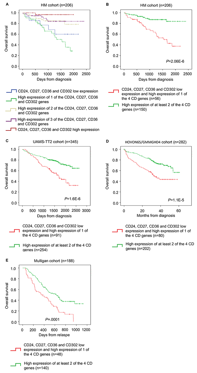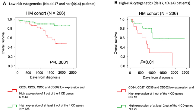 The cluster of differentiation (CD) includes cell surface molecules that are used for cell immunophenotyping. CD19, CD20, CD27, CD28, CD56 and CD117 are usually employed to discriminate normal bone marrow plasma cells (BMPC) from MMC [5]. The expression of these CD markers is not homogeneous in all MMC. Indeed, they are not aberrantly expressed in all patients with MM and their expression level is heterogeneous among patients and MM subclones [6-9]. Higher expression of CD117 and CD56 was identified in patients with hyperdiploidy whereas high CD56 expression and low CD117 expression was associated with t(4;14) MM patients. At the opposite, MAF molecular subgroup was characterized by high CD117 expression and low CD56 expression. CD20 expression is negatively correlated with amplification of chromosome 1q21 [10]. In this study, we analyzed and compared the expression of genes coding for CD antigens in BMPC and primary MMC from newly diagnosed patients using microarrays. We identified new CD genes that are differentially expressed between normal and malignant plasma cells. Furthermore, we found that the expression level of CD24, CD27, CD36 and CD302 has a prognostic value in independent cohorts of newly diagnosed patients with MM. Based on the expression level of CD24, CD27, CD36 and CD302, we then developed a new CD gene risk score that allows the identification of high-risk patients with MM at diagnosis and at relapse.